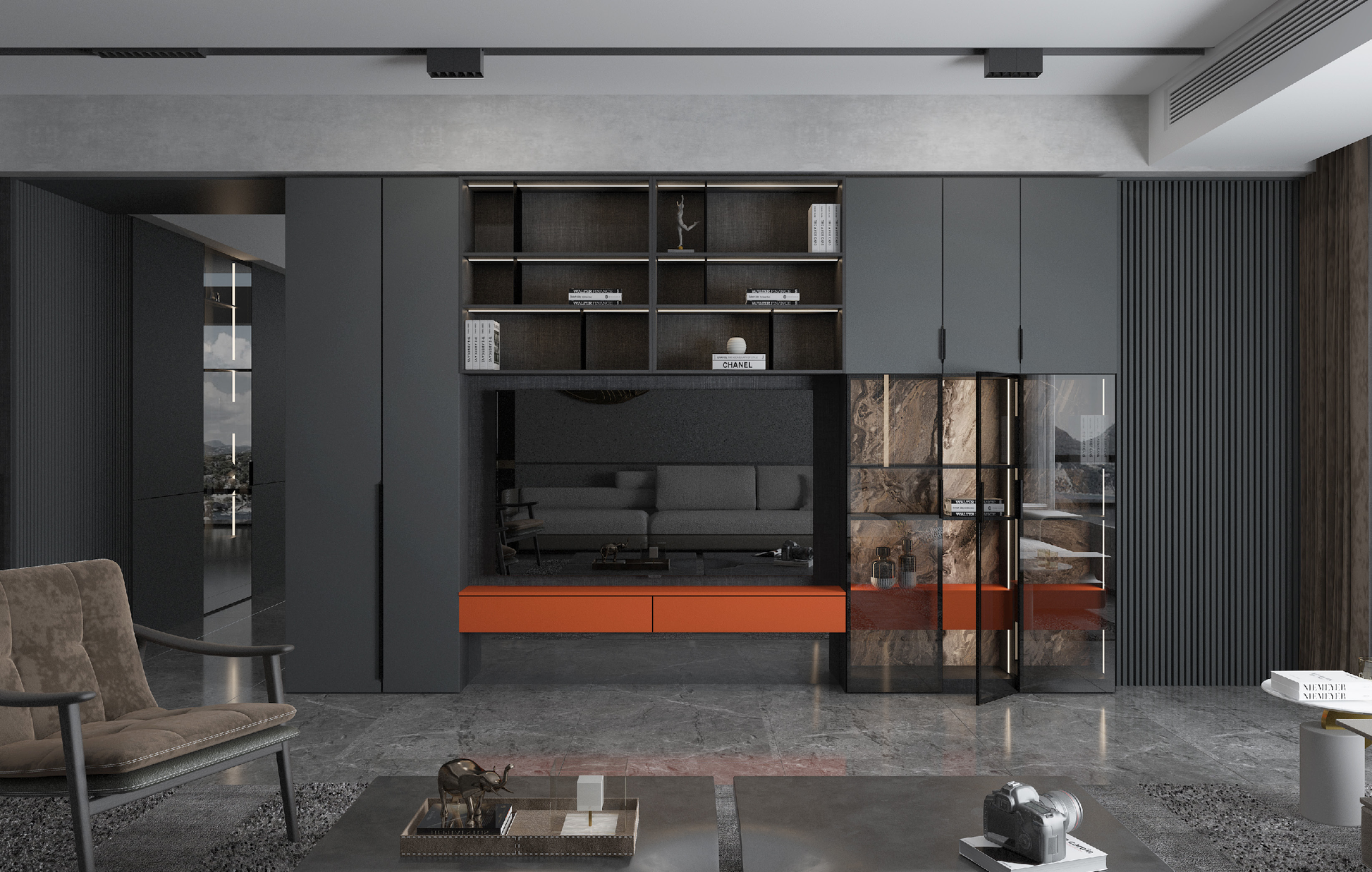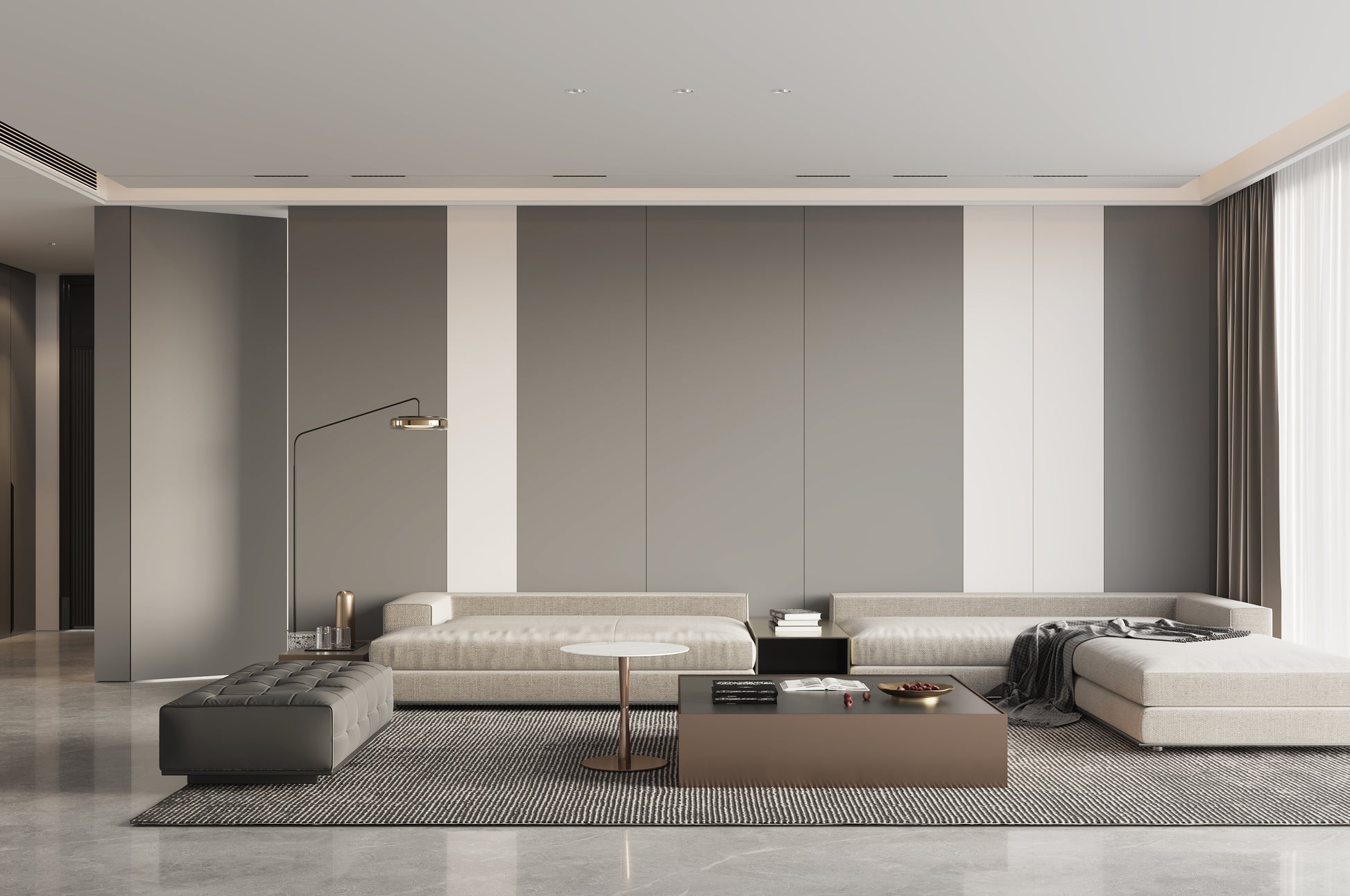 Interpret the minimalist space under soft gray tone infiltration together