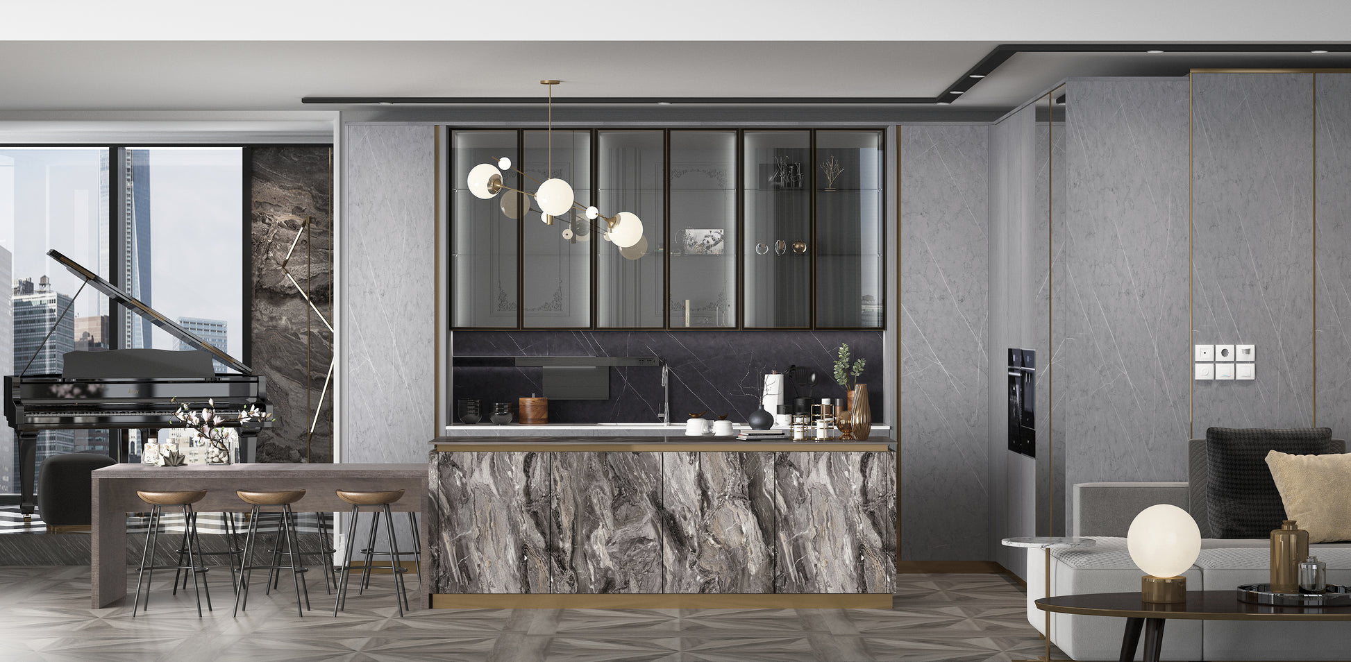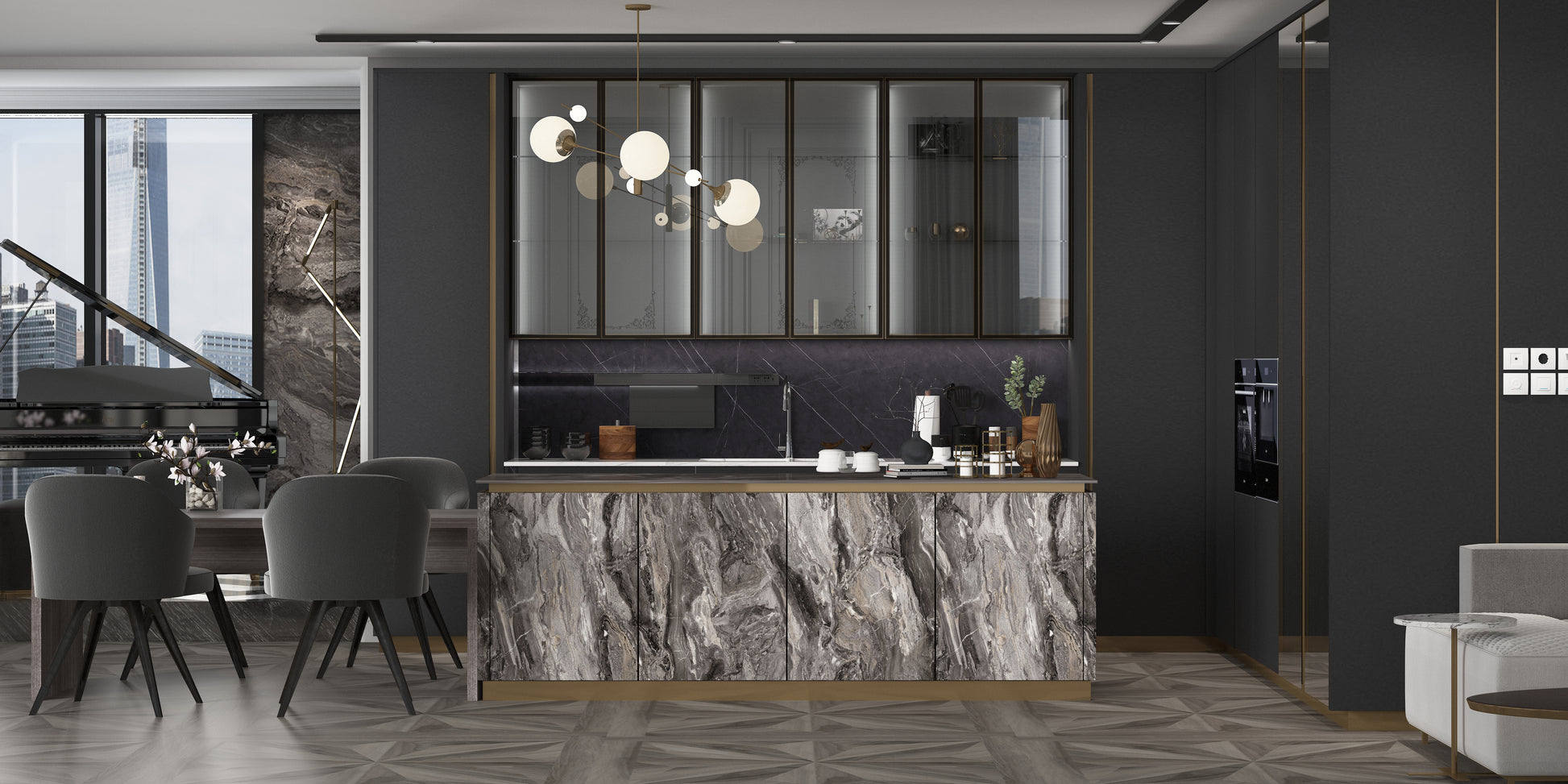 GoldenHome offers a variety of cabinet door panel options, including integrated panels, lacquer, thermofoil, and solid wood.