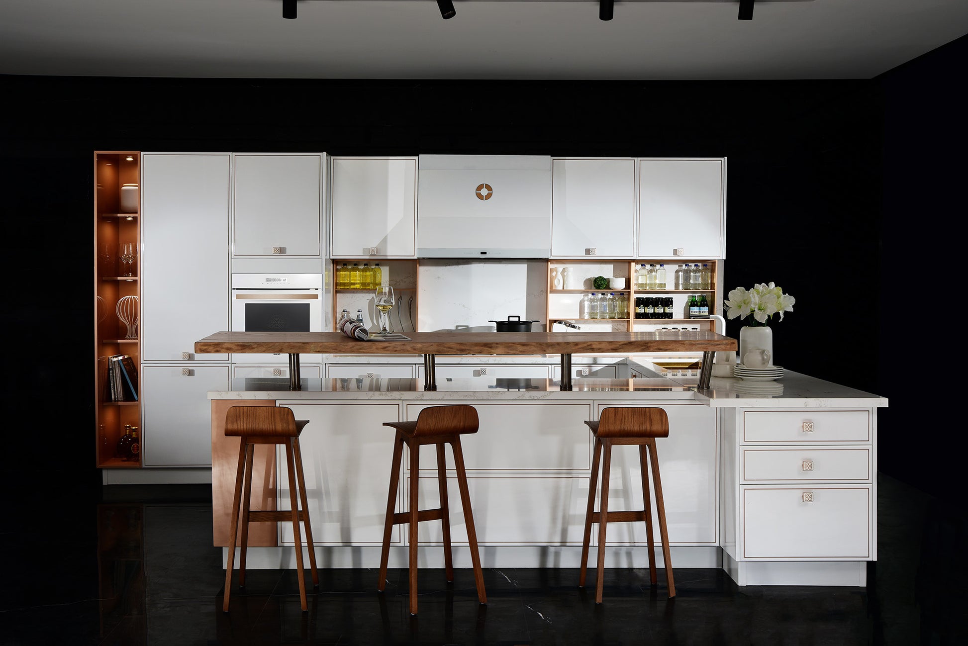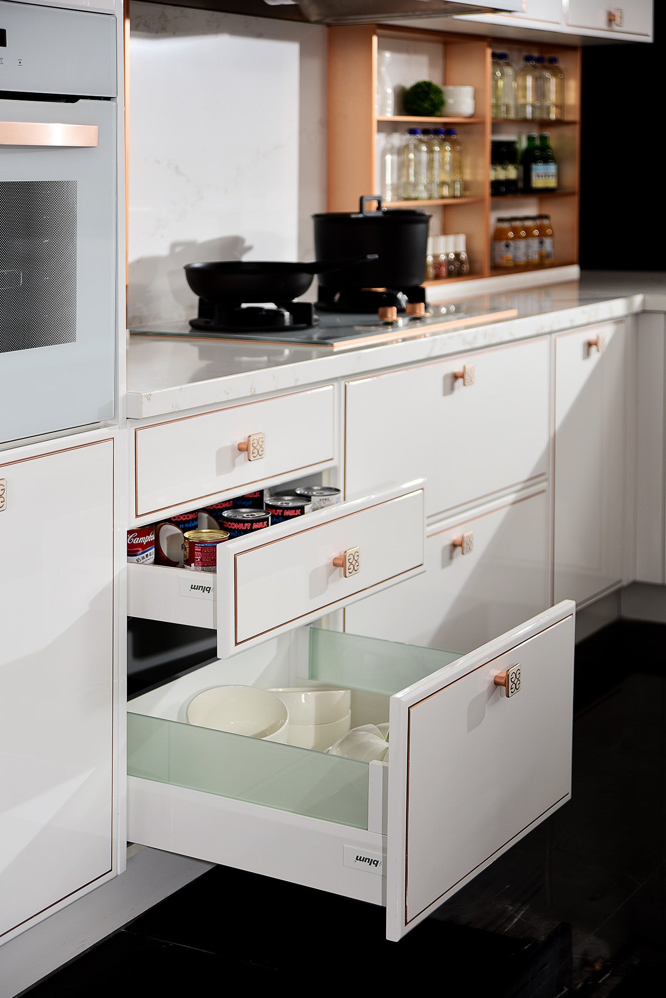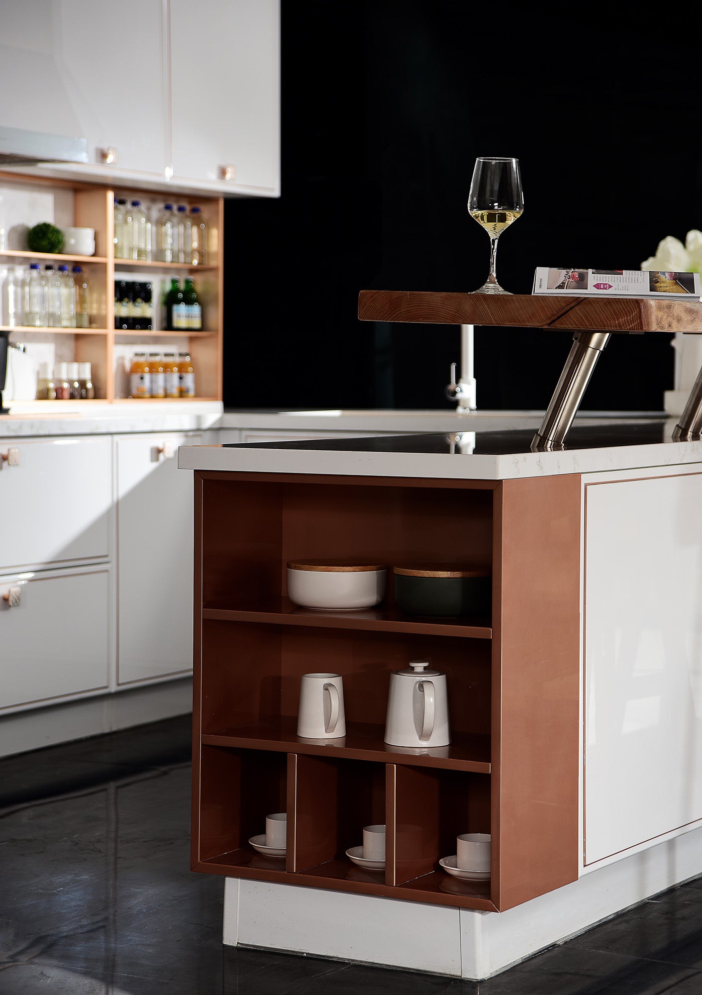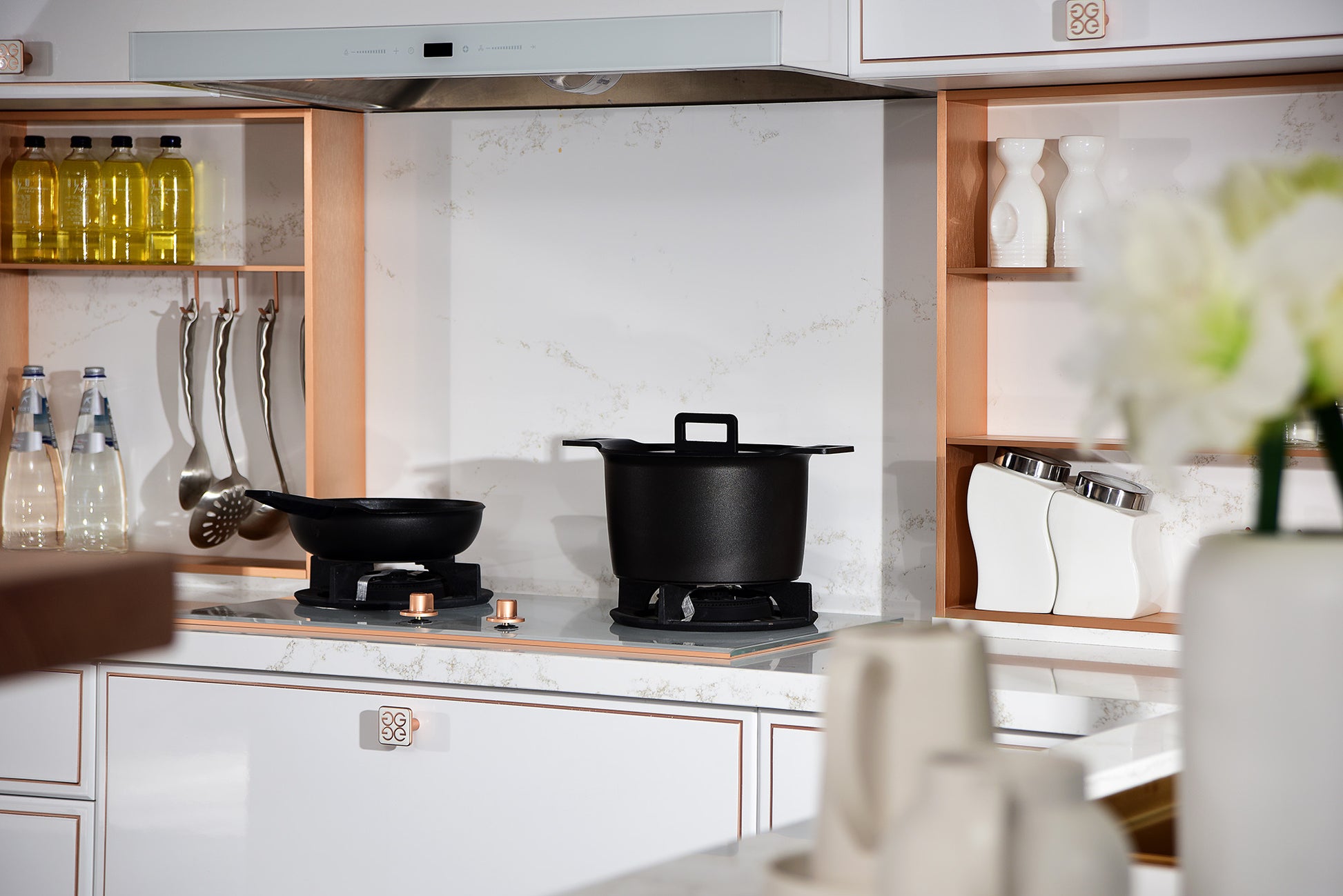 GoldenHome offers a variety of cabinet door panel options, including integrated panels, lacquer, thermofoil, and solid wood.